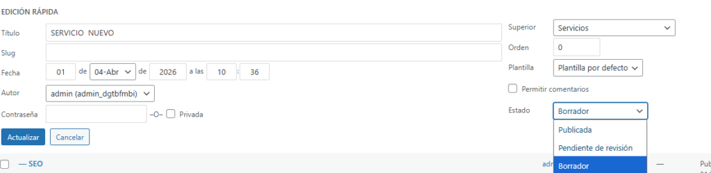 Pinchando en edición rápida, podemos cambiar el nombre y guardarla como borrador o publicar y damos a actualizar.