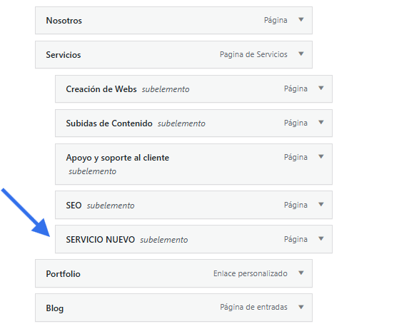 Podemos añadir la nueva página como una página principal. O podemos moverla y meterla dentro de una página principal como subelemento. ( Esto es lo que se refleja luego en la web como desplegable)