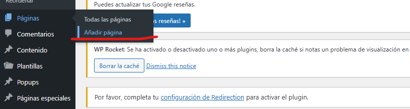 Añadir página para crear la nueva. Pinchamos sobre esta