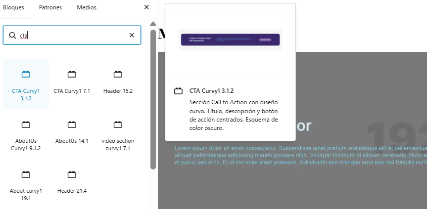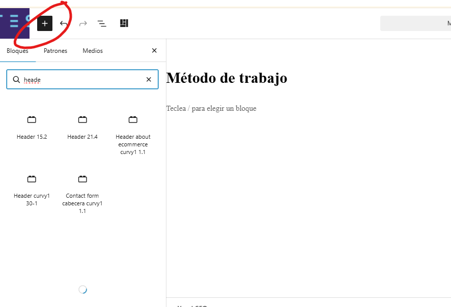Un header( cabecera). Pinchamos en el más para ver los bloques que tenemos cargados y en el buscador ponemos la palabra header