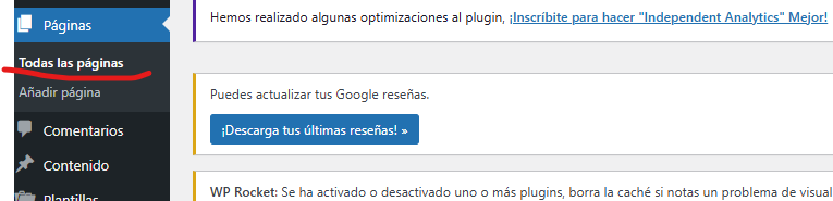 Todas las paginas: para ver las páginas que ya están creadas en la web.