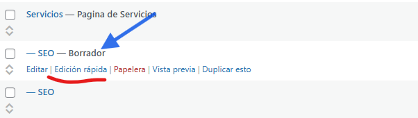 y aparecerá la pagina de SEO, en este caso, duplicada como borrador.