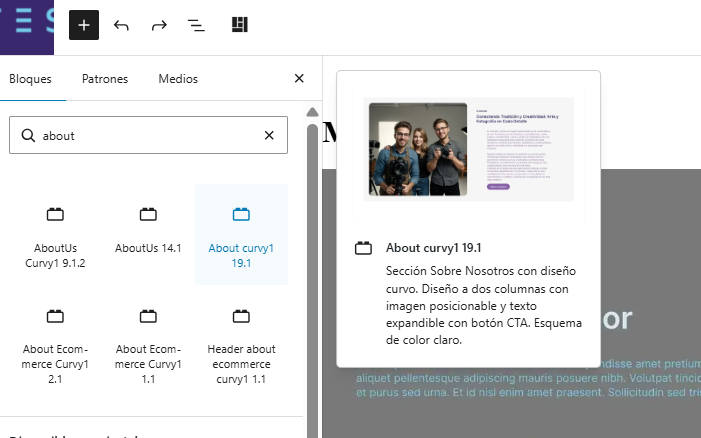 Añadimos ahora la cenefa de Nosotros con foto ( para explicar mi metodología de trabajo por ejemplo) . Repetimos con el más, la palabra en el buscador y con el cursor vemos las cenefas.