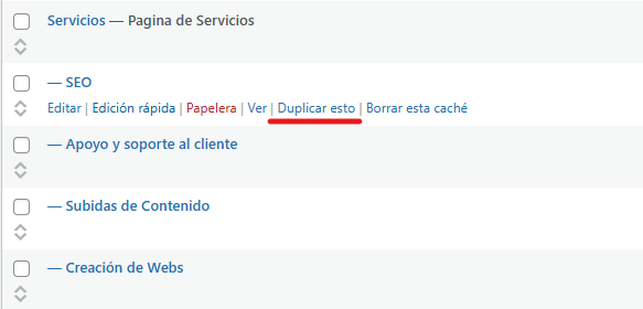 Verás todas las páginas que tienes publicadas en la web, y buscaremos la que queremos duplicar, que en este ejemplo será una de servicios.