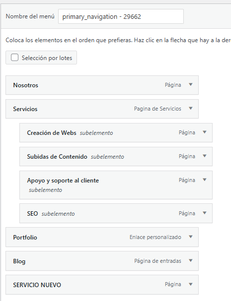 Al seleccionar primary menu, aparecerá en el lado derecho todas las páginas que hay en el menú de la web y en el lazo izquierdo, las que se pueden incluir