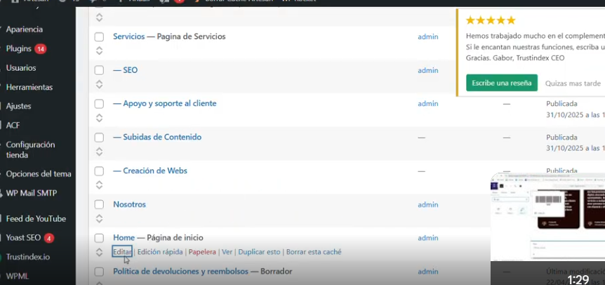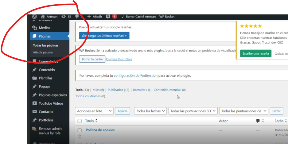 Ahora volvemos al editor de WordPress, y en el apartado páginas buscamos la página donde queramos poner el shortcode de Instagram. Por ejemplo en la Home