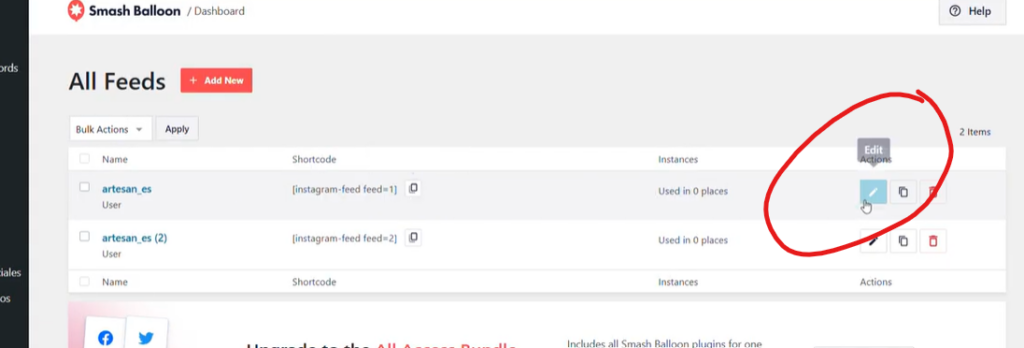 Una vez guardemos y estemos enlazados, volverá a aparecer la pantalla de All feeds con el Shortcode que necesitamos. Copiamos el shortcode