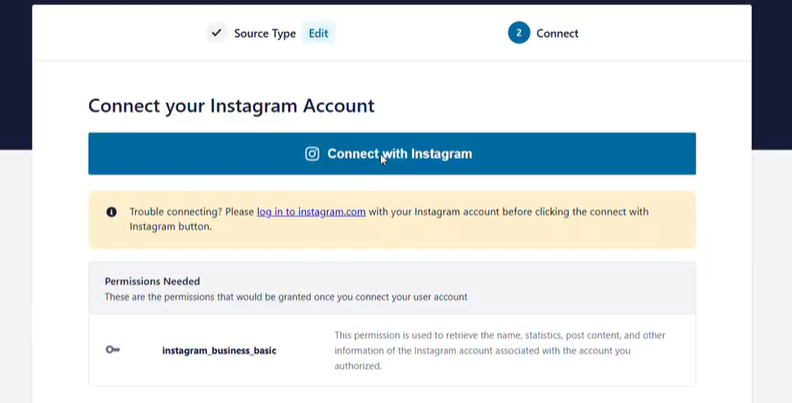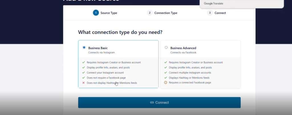 En la siguiente pantalla, escogemos Business Basic y le damos a Connect para conectar con nuestro instagram