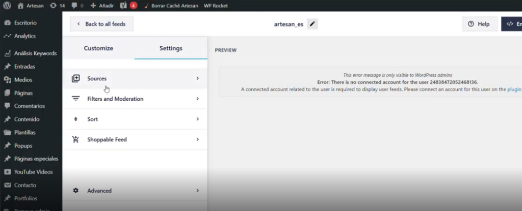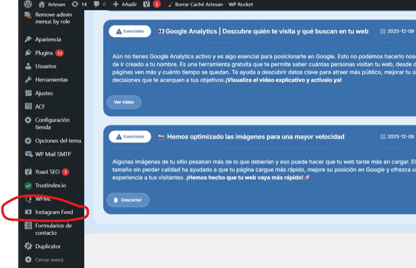 En la barra lateral del Admin, buscas la sección Instagram feed