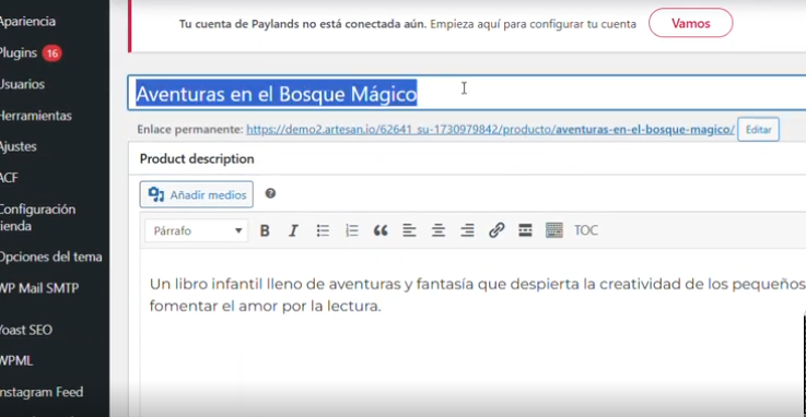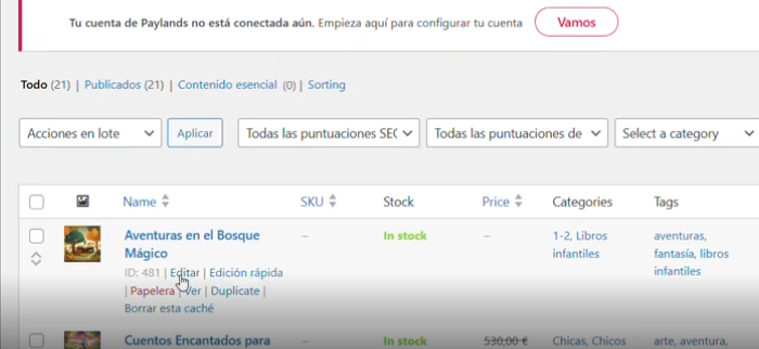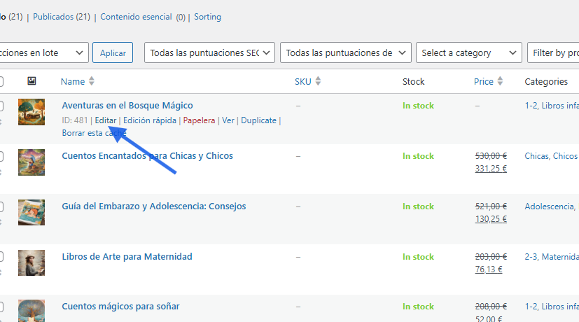 Volvemos de nuevo a los productos, y pinchamos para ver el listado que nos ha creado de ejemplo la web. Como decíamos, nuestra recomendación es que edites sobre uno que ya esté creado por la web y ya podemos empezar a editarlo.