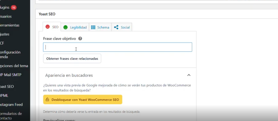 En Frase clave ponemos el título del producto y en metadescripción nuestra recomendación es poner la misma descripción que hemos puesto en el punto 5.1 y si queremos (opcional) ponemos un subtitulo al producto