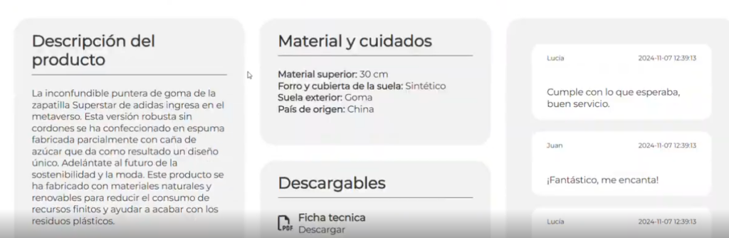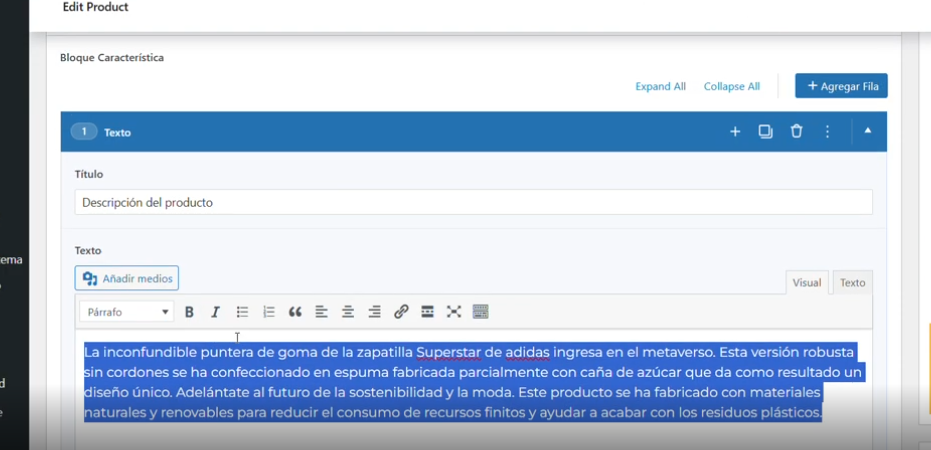 Cambiamos lo que queramos que se muestre en la Web: Título, Texto, características , dimensiones, descargables si tenemos alguna opción de descarga etc.. .Los apartados que no queramos mostrar, se pueden eliminar.