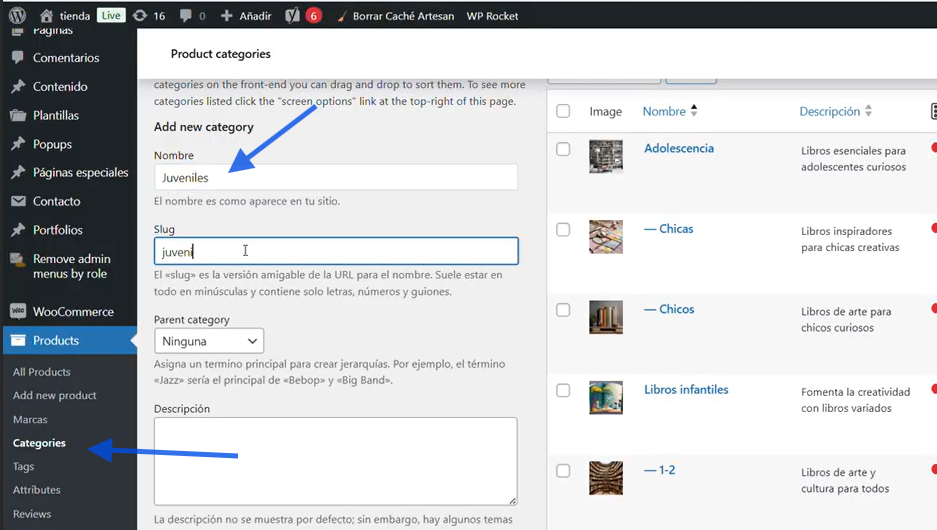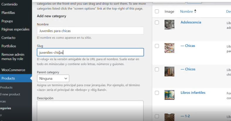 2.2 En Slug: pondremos la misma palabra; Juveniles o si son dos, por ejemplo categoría: juveniles para chicas, en Slug lo pondremos separado con guiones.