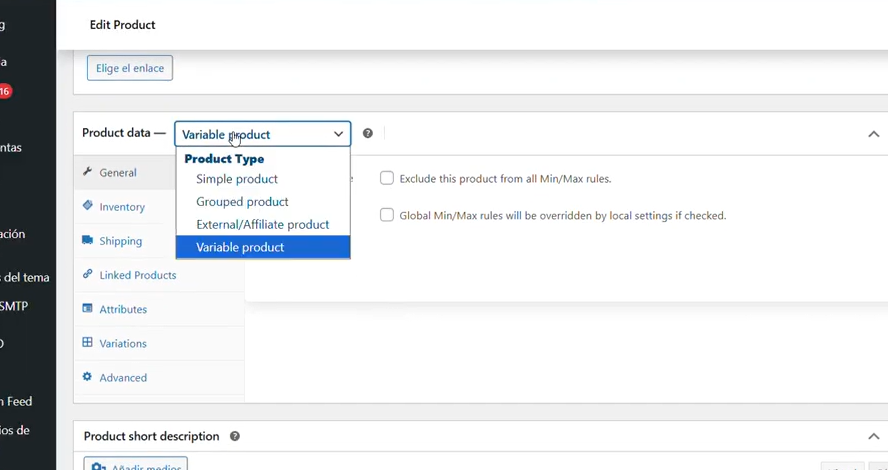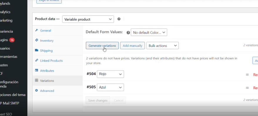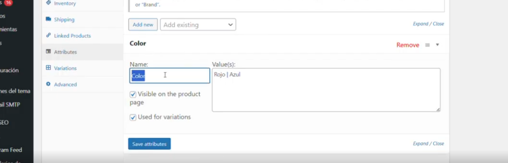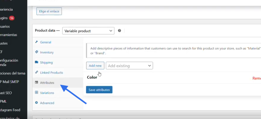 Si seleccionamos que el producto es Variable, tendremos que ir al apartado de atributos y añadir las variables que tiene , el producto.