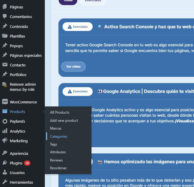 Volvemos a la barra izquierda del Admin, donde hemos seleccionado productos y aparecerá un desplegable con Categorías, ahí es donde debemos pinchar.
