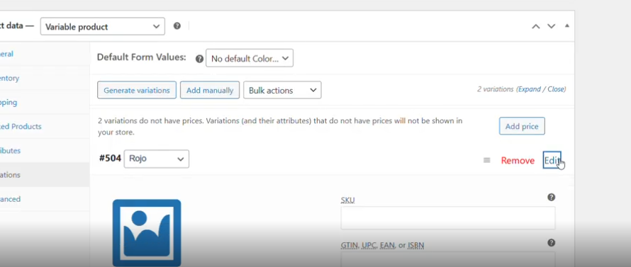 3.5 Vamos ahora a Variations, y comprobaremos que están puestas de forma correcta. Si clickamos sobre edit podemos editar las variaciones y subir una foto por ejemplo del producto en rojo y otra del producto azul. También podemos editar el precio de cada una de ellas.